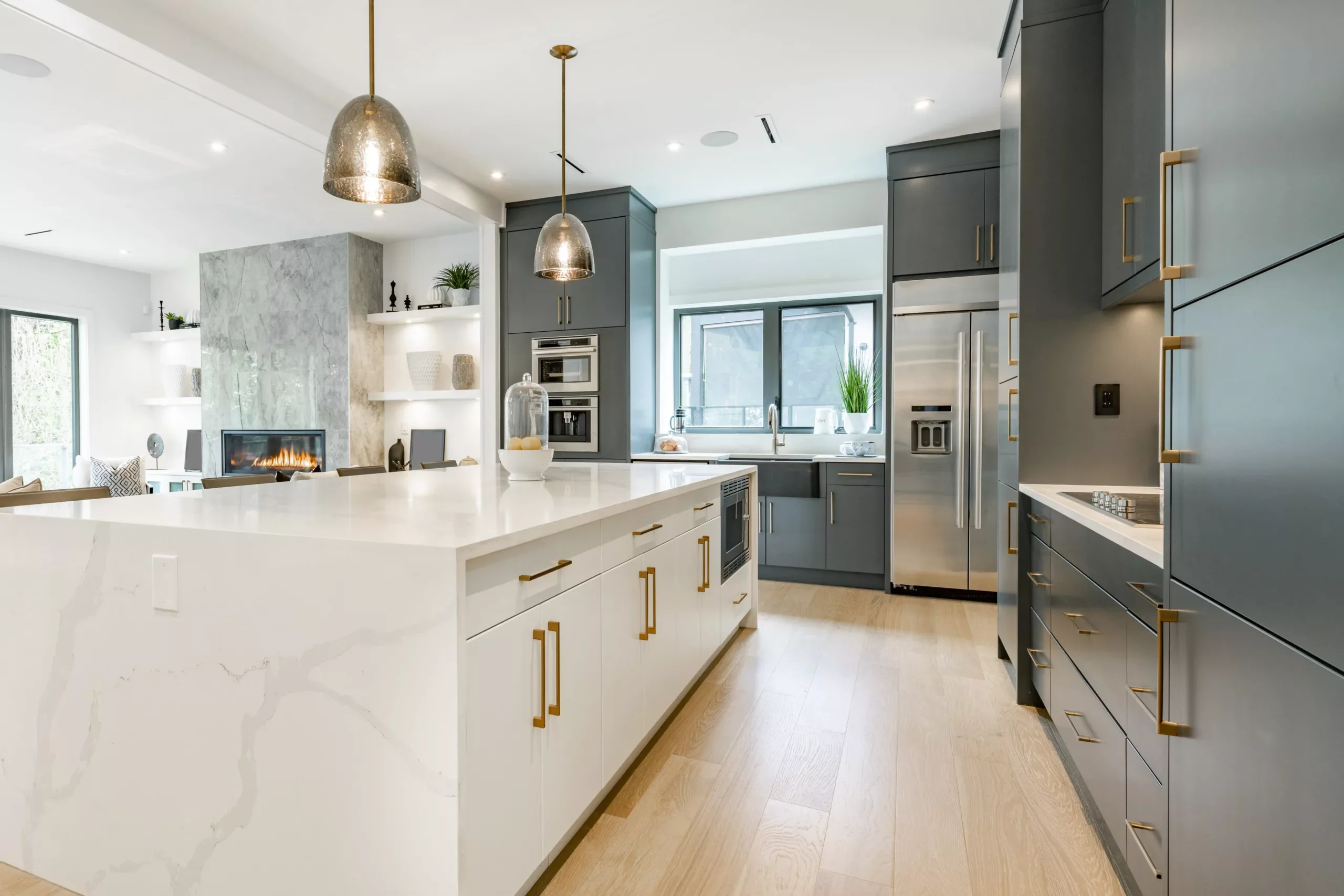 This kitchen renovation brings a perfect harmony of color and function. The bold matte blue cabinetry contrasts beautifully with the white waterfall quartz island, creating a sophisticated modern aesthetic. Gold hardware, pendant lighting, and a stylish pot filler add a touch of luxury, while integrated appliances and smart storage solutions make the space both beautiful and practical. The open layout and natural light complete the inviting atmosphere, perfect for both everyday living and entertaining.