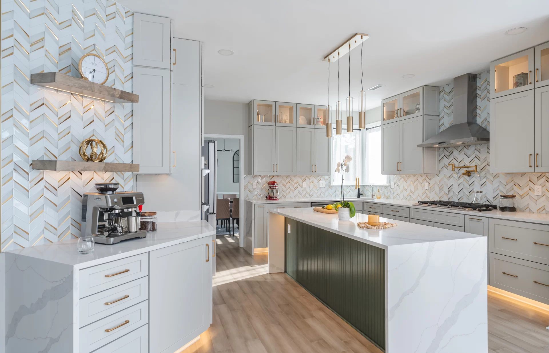 A bold and stylish kitchen renovation showcasing chevron backsplash, gold hardware, and luxury under-cabinet lighting.